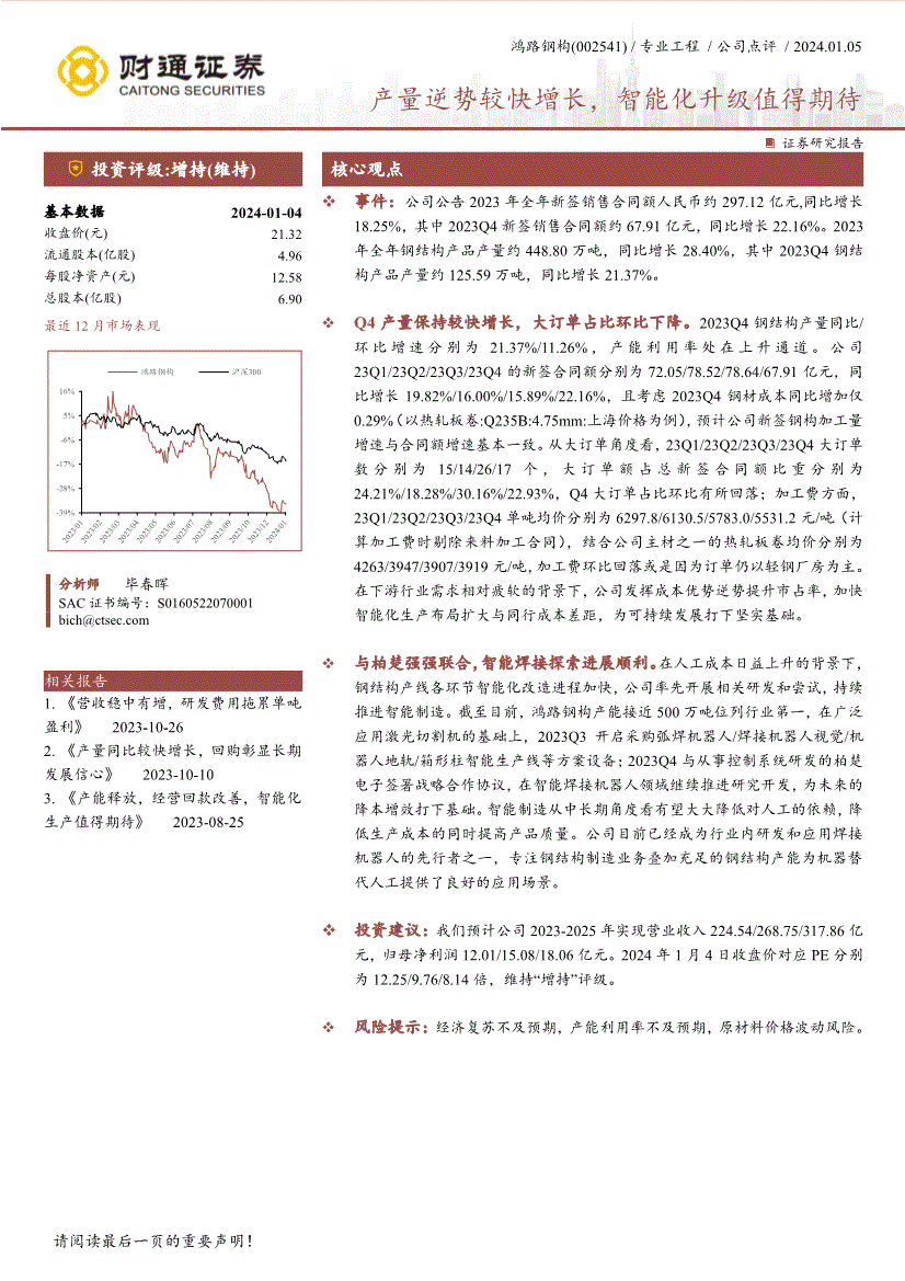 鸿路钢构(002541) /专业工程/公司点评/ 2024.01.05 ! 产量逆势较快增长,智能化升级值得期待 证券研究报告投资评级:增持(维持) 核心观点基本数据2024-01-04 收盘价(元) 21.32 流通股本(亿股) 4.96 每股净资产(元) 12.58 总股本(亿股) 6.90 最近12月市场表现分析师毕春晖SAC证书编号:S01 相关报告1. 《营收稳中有增,研发费用拖累单吨盈利》 2023-10-26 2. 《产量同比较快增长,回购彰显长期发展信心》 2023-10-10 3. 《产能释放,经营回款改善,智能化生产值得期待》 2023-08-25 事件:公司公告2023年全年新签销售合同额人民币约297.12亿元,同比增长18.25%,其中2023Q4新签销售合同额约67.91亿元,同比增长22.16%。
